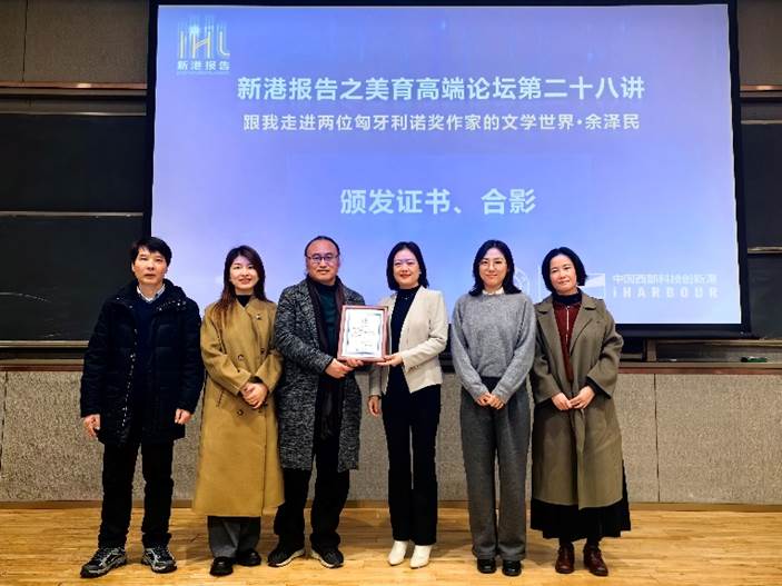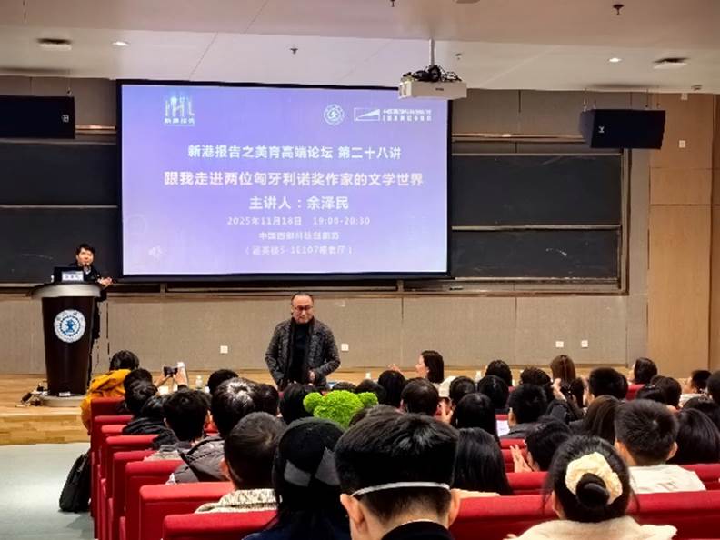 为营造高校美育氛围,提升学生审美感受力和鉴赏力,开发西安交通大学创新港校区美育第二课堂,2025年11月18日晚,由西安交通大学研究生院、人文学院主办的“新港报告之美育高端论坛”第二十八讲在西安交通大学创新港校区涵英楼报告厅成功举办。本次论坛以“跟我走进两位匈牙利诺奖作家的文学世界”为主题,特邀余泽民教授担任主讲嘉宾,余教授是旅匈作家、匈牙利语翻译家,中国作家协会会员。他先后翻译包括2002年诺奖作家凯尔泰斯、2025年诺奖作家克拉斯诺霍尔卡伊多部作品在内的近三十部作品,被匈牙利政府授予“匈牙利文化贡献奖”,被称作“当代匈牙利文学的中国声音”。人文学院副院长张勇担任主持人,人文学院党委书记纪梦然、中文系主任王瑶和教师代表出席,全校各学院同学积极参与。