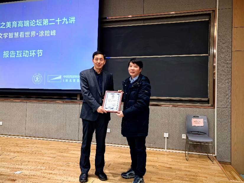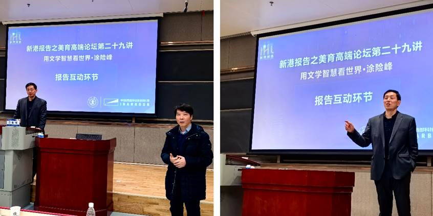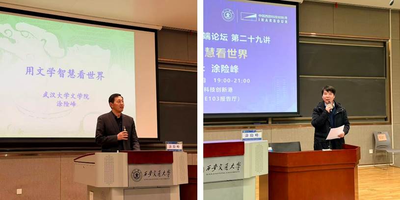 为营造高校美育氛围,提升学生审美感受力和鉴赏力,2025年12月2日晚,由西安交通大学研究生院、人文学院主办的“新港报告之美育高端论坛”第二十九讲在西安交通大学创新港校区涵英楼报告厅成功举办。本次论坛以“用文学智慧看世界”为主题,特邀武汉大学文学院教授、比较文学与世界文学专业博士生导师涂险峰教授担任主讲嘉宾。涂险峰教授近年主要从事外国文学与哲学的跨学科研究。讲座由人文学院副院长张勇主持,人文学院中文系教授、博士生导师魏策策和青年教师谭静等代表出席。全校各专业硕博研究生积极选修,会场座无虚席。
