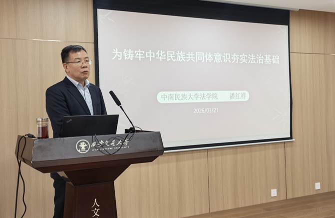 3月23日下午,由西安交通大学党委统战部、人文社会科学学院及西安交通大学铸牢中华民族共同体意识研究中心联合主办的“130周年校庆人文学院系列高端报告”在兴庆校区主楼E座703会议室举行。中南民族大学法学院院长、二级教授、博士生导师潘红祥应邀作题为“《民族团结进步促进法》的立法理念和制度创新”的专题报告。党委统战部李巨星副部长、基地首席专家边燕杰教授、人文学院纪梦然书记、王伟副院长及各系所中心主任、支部书记等参加了讲座。报告会由人文学院院长李黎明教授主持。