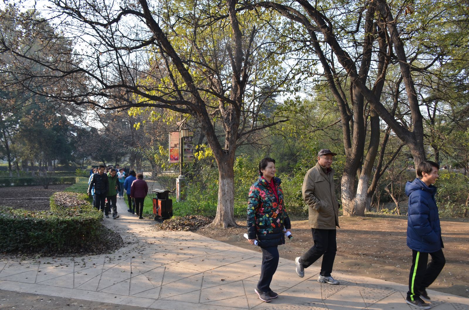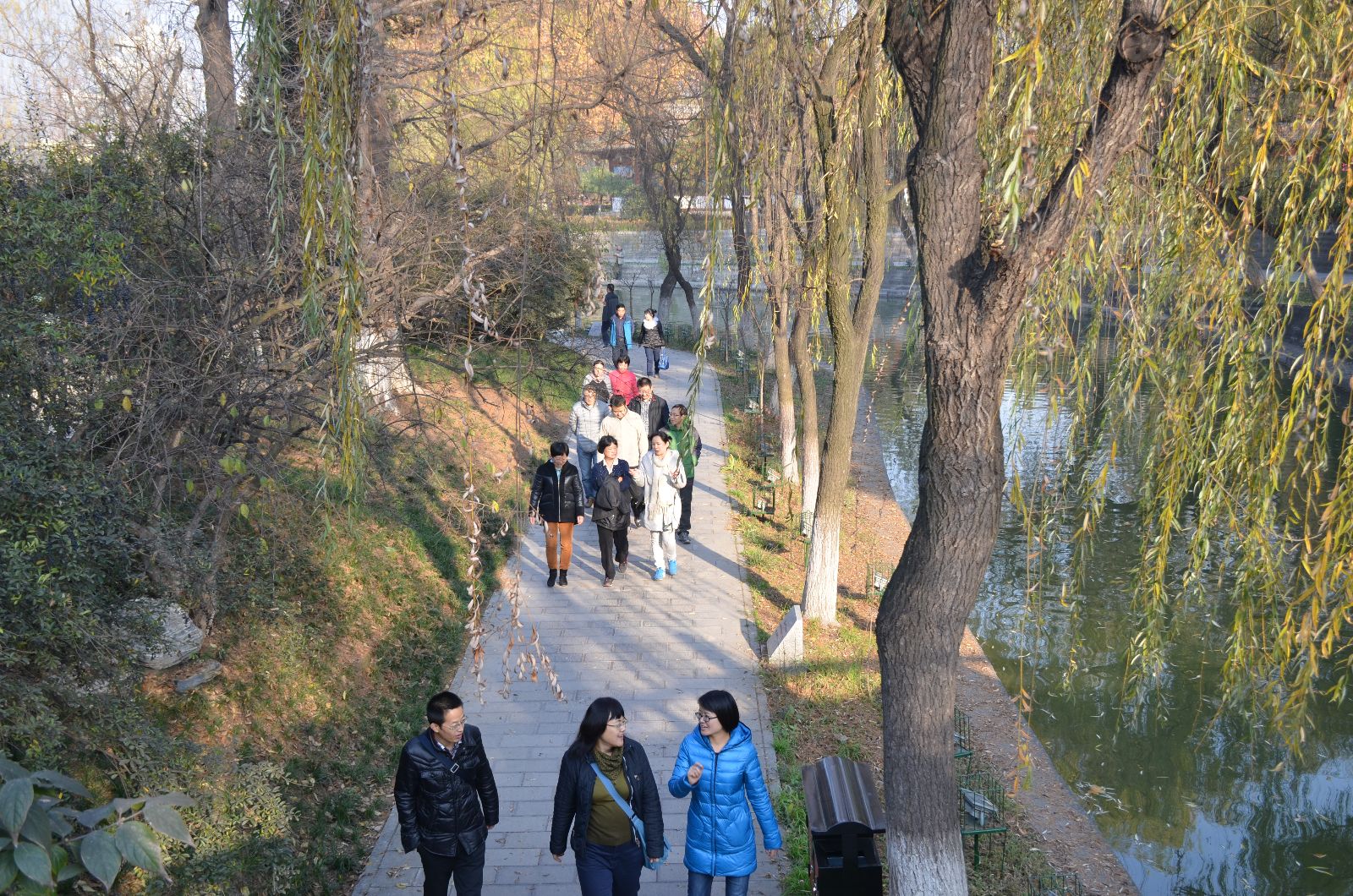 2015年11月27日下午三点,兴庆湖畔,阳光明媚。人文学院第一期健身活动——“兴庆湖畔健步走”正式开始。来自学院各个系的三十多位教工身穿运动衣,脚蹬轻便鞋,昂首阔步,沿着兴庆湖畔快步行进。健步队伍当中有知名的老教授,也有新加盟的青年教师。在焦垣生教授的带领下,大家沿着兴庆湖畔边走边聊,队伍里不时传出欢快的笑声;有的在健步途中,摆个造型,留下倩影;有的边走边沉浸在“片片枫叶情,浓浓秋冬意”的美好意境中。健步走环湖两圈,总长5公里,一个小时走下来,教工们面色红润,微微出汗。凡是参加活动的老师都获得了一份温馨的礼物,突出了健身活动的参与意识。